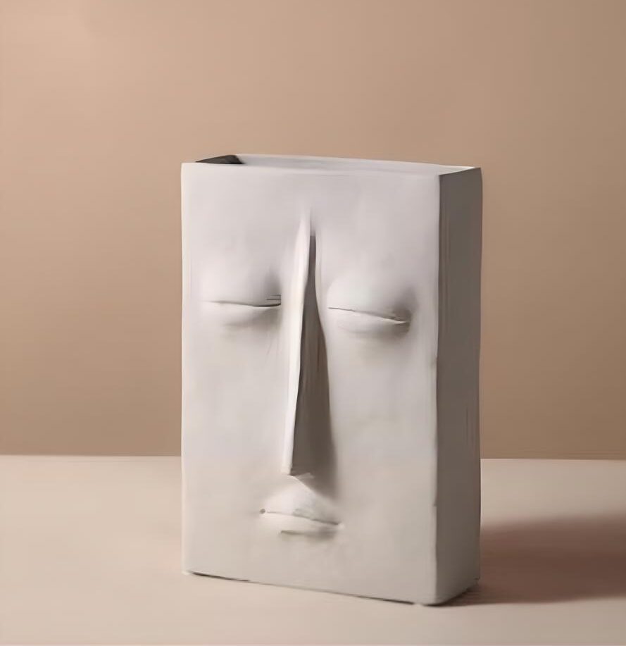 A minimalist rectangular sculpture featuring a serene face with closed eyes, crafted...